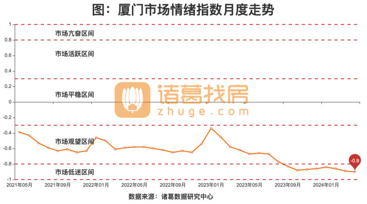 根据诸葛找房数据研究中心监测数据显示,2024年04月,厦门市场情绪指数为-0.9,较上月下降0.01,位于市场低迷区间。