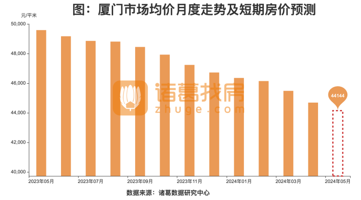 从房价水平来看,4月厦门市场均价为44688元/㎡,环比下降1.75%,同比下降10.15%。根据情绪指数模型,预测厦门未来短期内价格下降,未来1个月价格下降至44144元/㎡,累计下降1.22%。