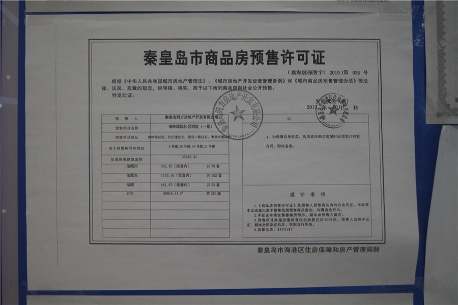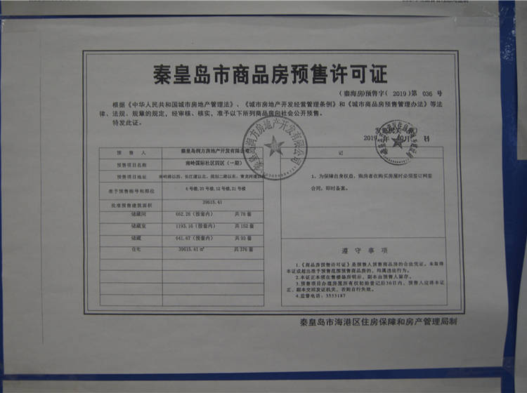 - (秦海房)预售字(2019)第036号 详情发证时间 2019-10-15绑定楼栋6号楼、12号楼、20号楼、21号楼。