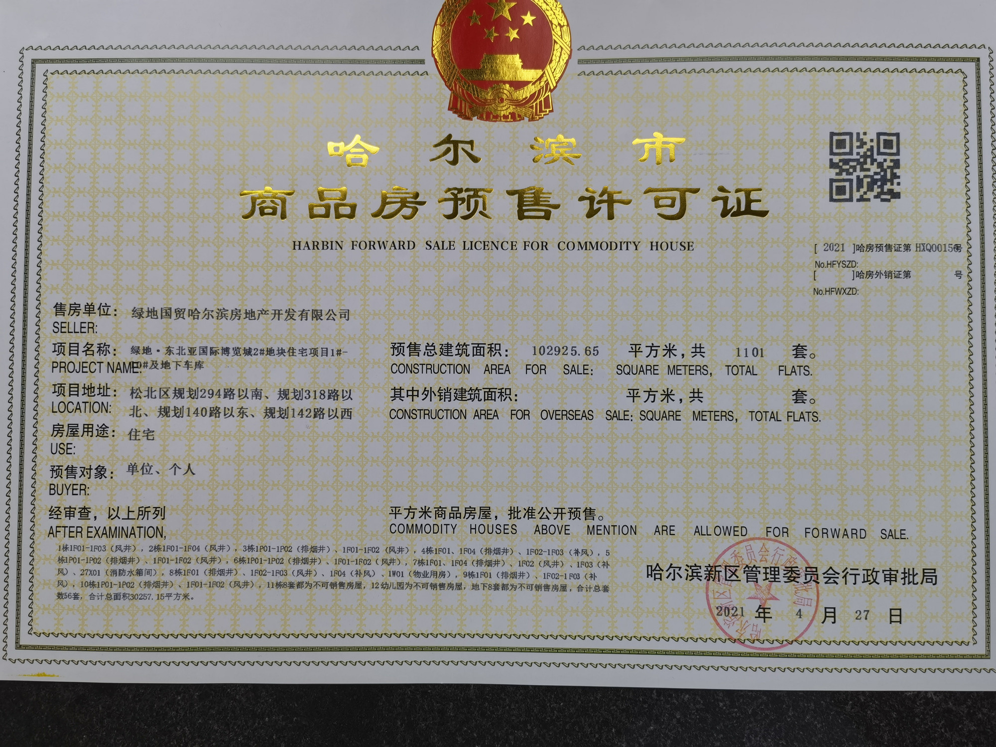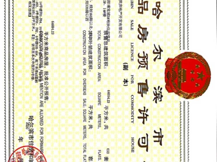- 【2021】哈房预售证第HXQ00150号 详情发证时间 2021-04-27绑定楼栋绿地·东北亚国博城黄浦公馆IV期证件照片