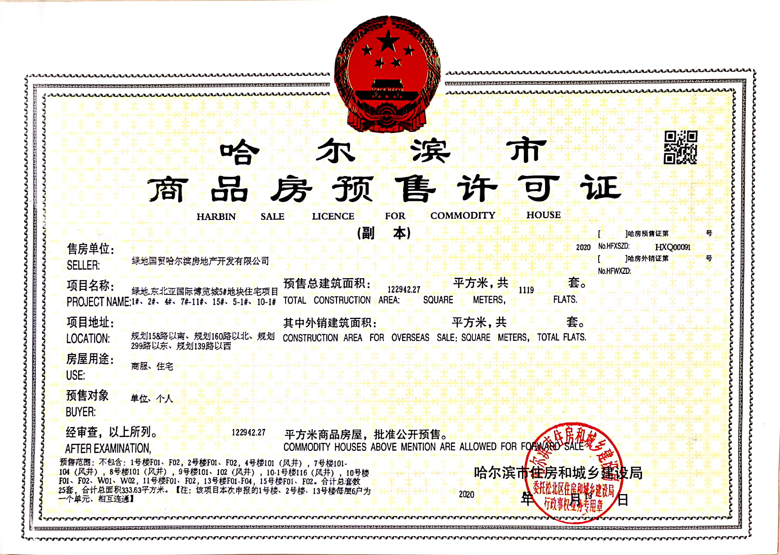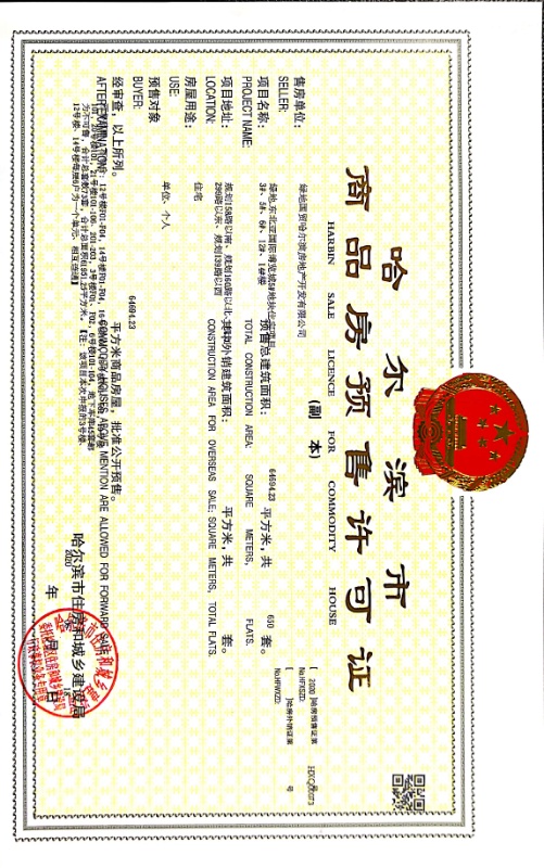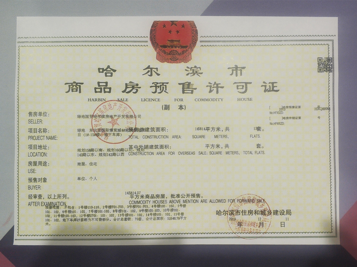 - 【2019】哈房预售证第HXQ00064号 详情发证时间 2019-12-11绑定楼栋4#地块1#-15#楼、地下车库证件照片
