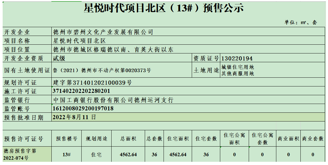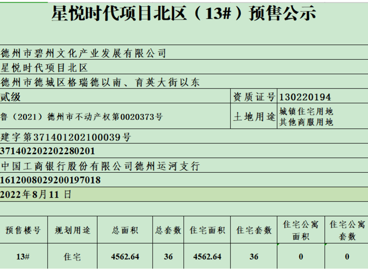 - 德房预售字第2022-74号 详情发证时间 2022-08-11绑定楼栋北区(13#)证件照片