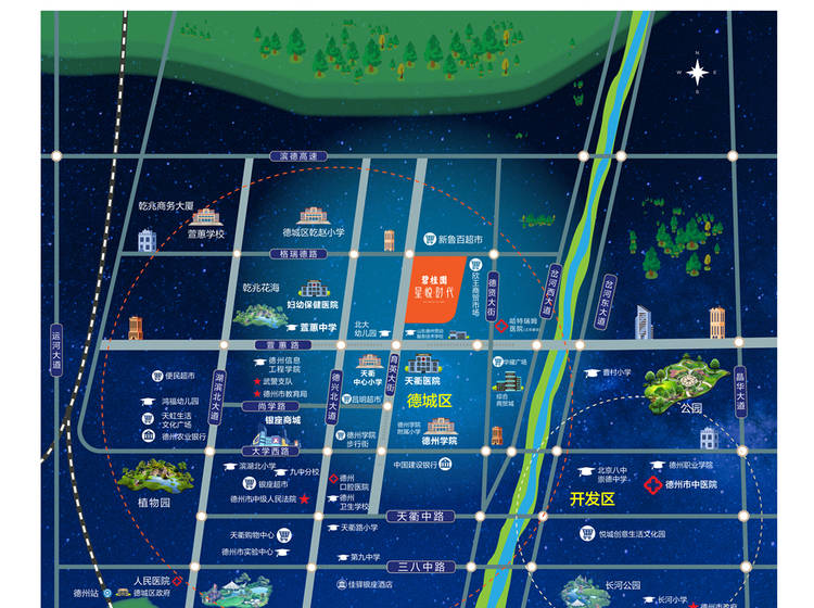 项目东侧德贤大街以东为东北商贸城,项目南侧有天衢购物中心(4.7KM)、银座商城(3.9KM)、德州百货大楼(7.4KM)等大型购物广场。同时项目西侧配套约4000㎡的社区底商。
