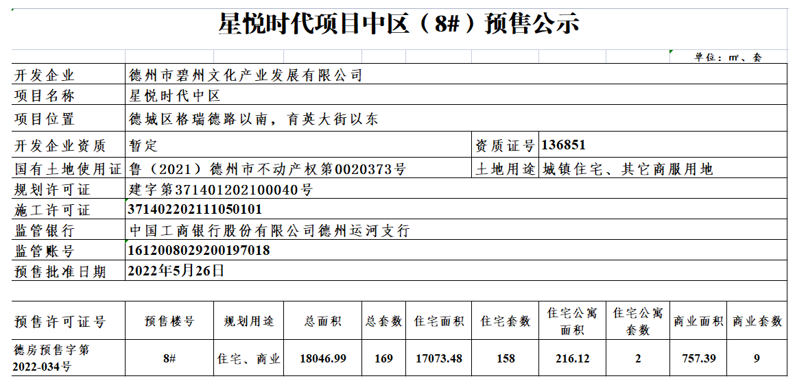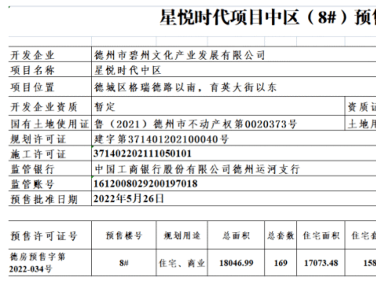 - 德房预售字第2022-034号 详情发证时间 2022-05-26绑定楼栋星悦时代项目中区8#证件照片