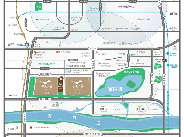 学校:项目北侧:彭州一中(建设中),九年制义务教育学校。项目南侧:彭州市机关幼儿园,公立学校,为彭州市梯队靠前的学前教育资源。 商圈:置信逸都城:项目总体量约10万平方米,集购物、美食、休闲、运动、娱乐等多功能于一体的 “购物中心”。时尚·奥特莱斯:打造彭州中高端商业圈,目前正在招商中。 医院:彭州市人民医院(三级乙等):距离项目约2公里。现为西南医科大学、川北医学院、成都中医药大学、成都医学院等院校临床教学医院,成都大学附属医院医联体重点建设单位。彭州市妇幼保健院(三级乙等):距离项目约2公里。 公园:配建公园、塞纳湖体育运动公园; 其他:毗临塞纳湖,邻近青白江;