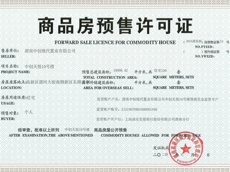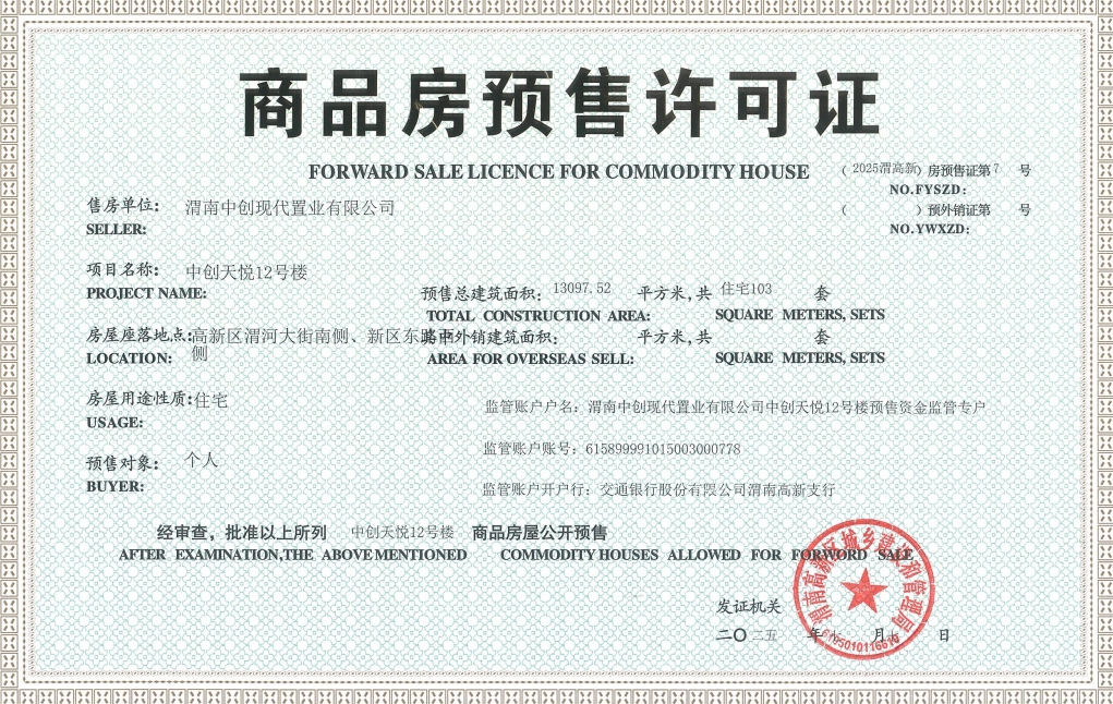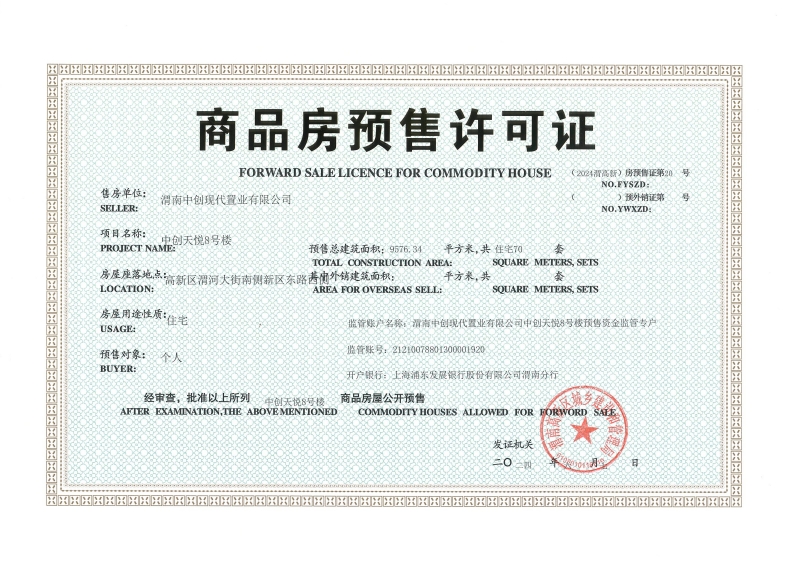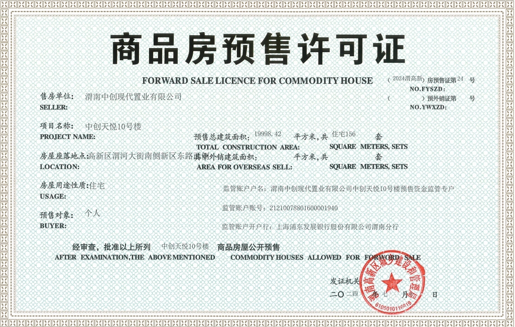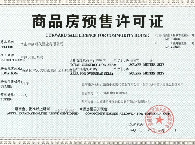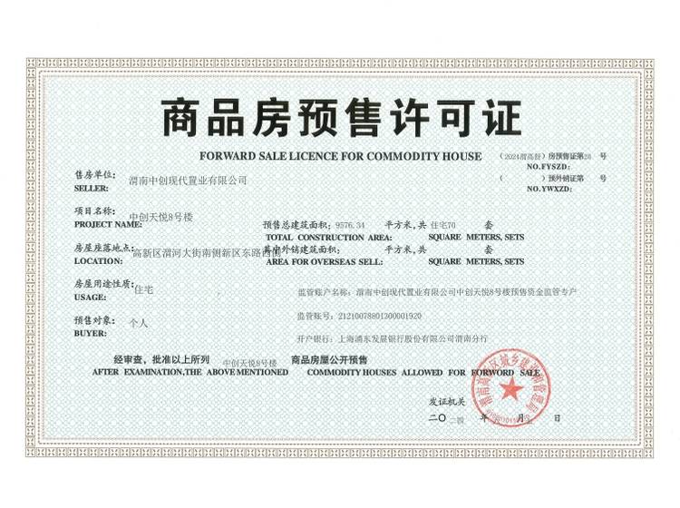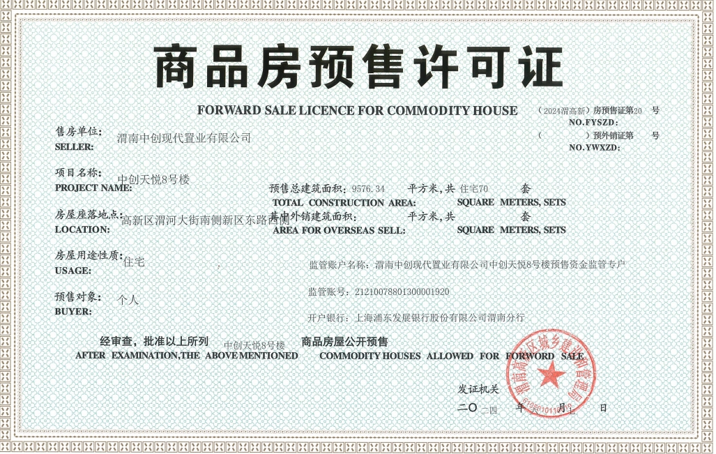 - 2024渭高新房预售证第20号 详情发证时间 2024-06-07绑定楼栋渭南中创现代置业有限公司中创天悦8号楼证件照片