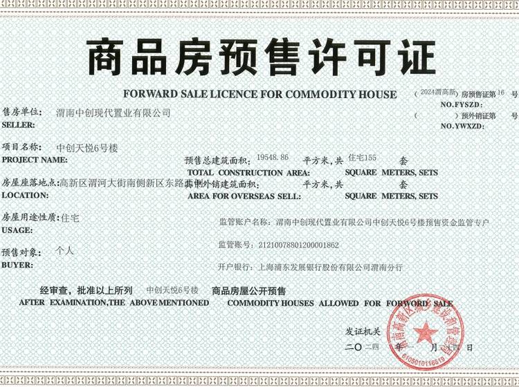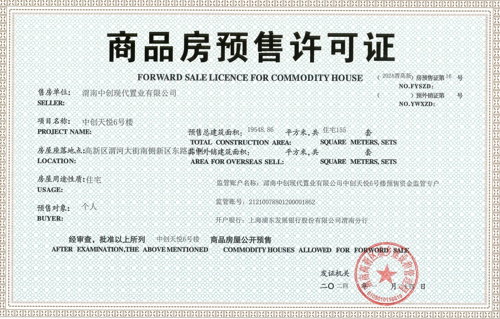 - 2024渭高新房预售证第16号 详情发证时间 2024-01-24绑定楼栋渭南中创现代置业有限公司中创天悦6号楼证件照片