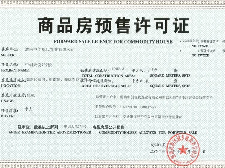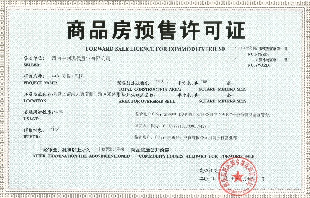 - 2024渭高新房预售证第36号 详情发证时间 2024-11-18绑定楼栋渭南中创现代置业有限公司中创天悦7号楼证件照片