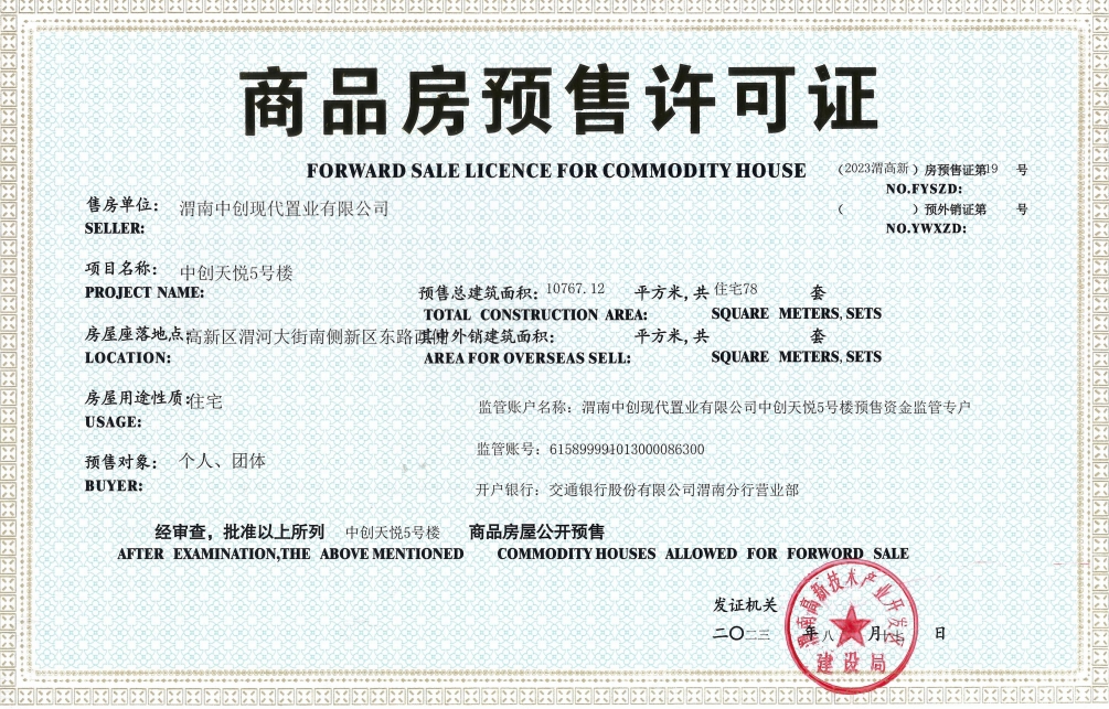 - 2023渭高新房预售证第19号 详情发证时间 2023-08-17绑定楼栋渭南中创现代置业有限公司中创天悦5号楼证件照片