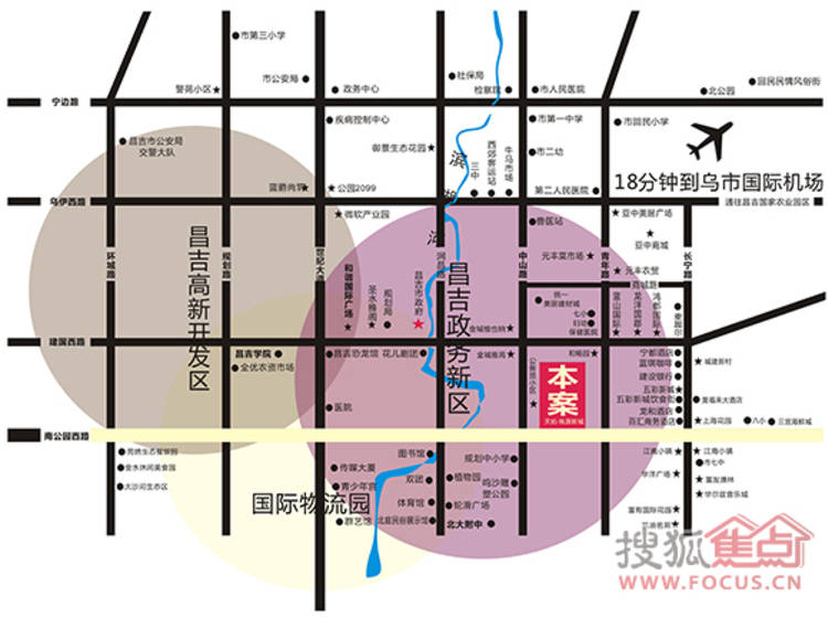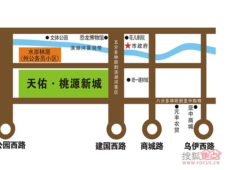 昌吉州公务员小区、昌吉市市政府、恐龙博物馆、滨湖河200亩大型人工湖公园、统一美居城、亿家超市、亚种商城。