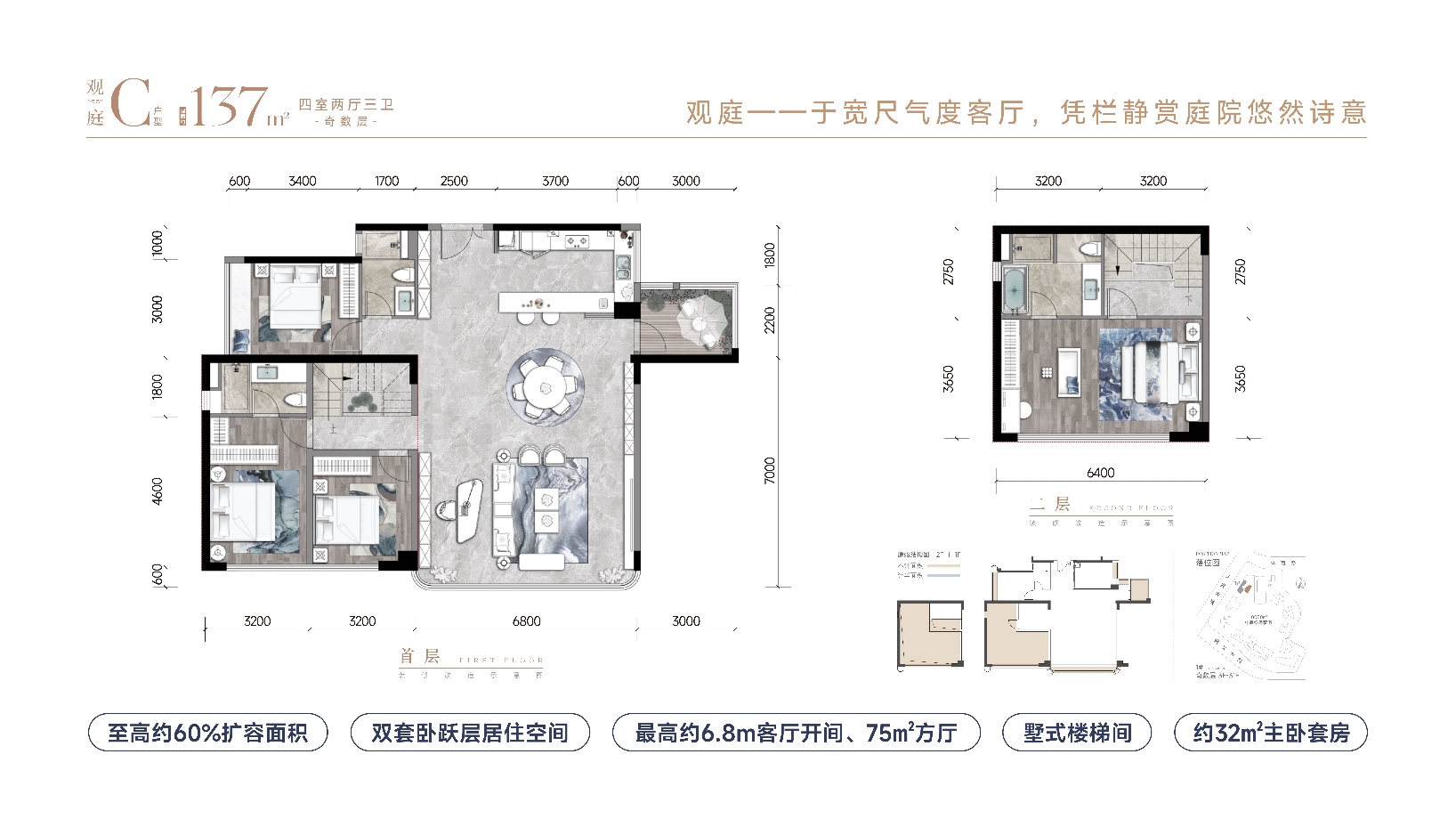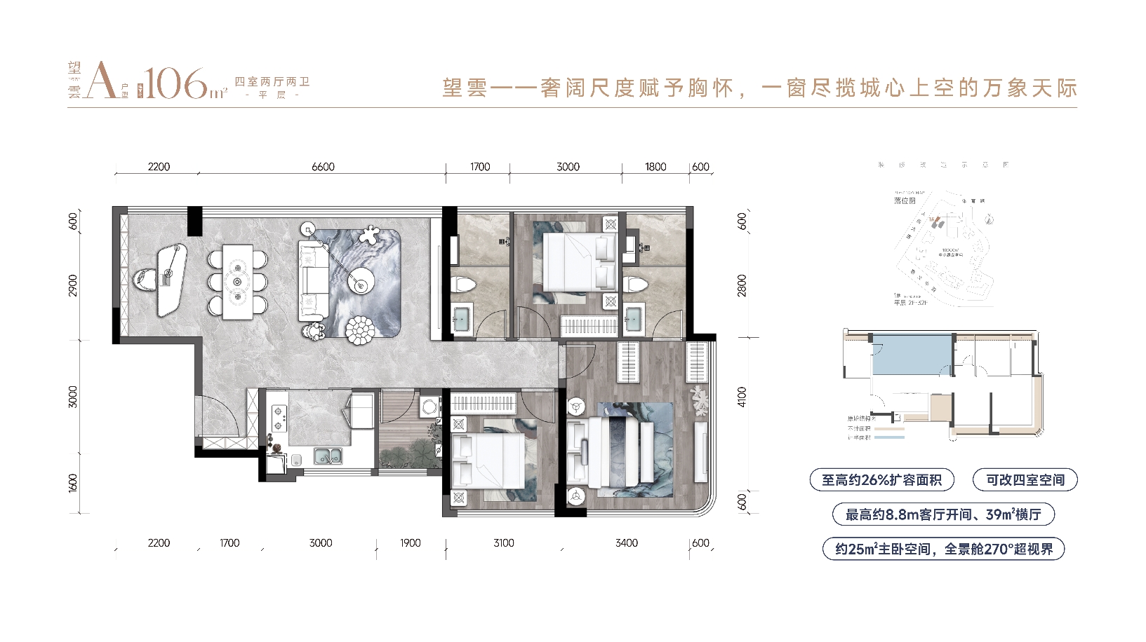 洋浦・頭号山,万象城旁10000㎡中庭绿岛的奢宅,坐落于南明区人民大道与解放路交汇处东南侧,是中国民营企业500强旗下洋浦地产继洋浦·觀山玉后的贵阳又一力作。坐拥黄金生活圈,近距万象城、地铁一号线,尽享商业、医疗、教育、交通等丰盈配套。以瑰丽人居封面美学,迭代南明天际线,全景玻璃幕墙,超高窗墙比,拉阔瞰景视野。万平都心园林演绎六大美学岛境、十大主题场景及七重归家礼序。奢筑建面约106㎡光幕平层、122-137㎡瞰景跃墅。南明惟此2T3设计,负公摊理念构建最高约62%扩容面积,最大客厅面宽达约8.8m,部分户型私享270°转角落地窗。洋浦物业服务携手金钥匙物业管理,以高标准服务内容为业主保驾护航!
