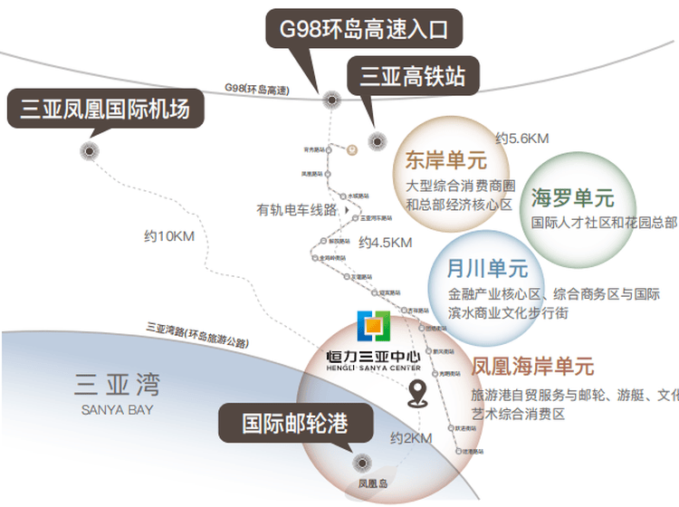 交通:海港:距离三亚凤凰岛国际邮轮港约 2 公里,380 多个航次的国际邮轮经停,航线覆盖 30+ 国家和地区。路网:未来海底隧道和高速磁悬浮列车畅达全岛(于三亚高铁站搭乘);距三亚高铁站约 4.5 公里;距 G98 环岛高速约 5.6 公里,近邻环岛旅游公路空及环热带雨林旅游公路。空港:距离凤凰国际机场约 12 公里,109 条航线通达全球。