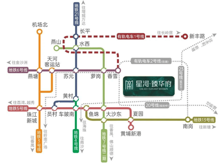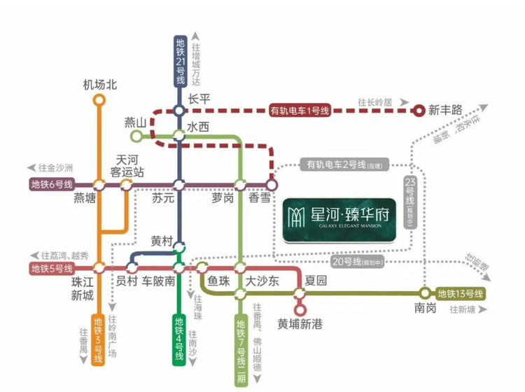 【交通配套】1、地铁:距离6号线香雪地铁站仅1.6公里,一站换乘7号线,2站换成21号线,快线4站到天河;规划中的地铁20、23号紧邻项目。