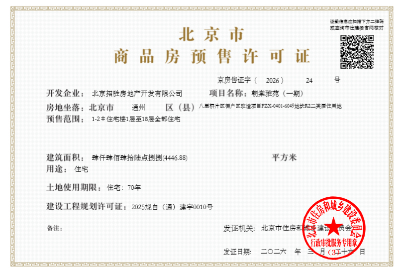 - 京房售证字(2026)24号 详情发证时间 2026-03-26绑定楼栋1-2#住宅楼1层至18层全部住宅证件照片