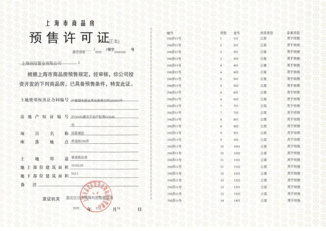 - 嘉定房管(2025)预字0000446号 详情发证时间 2025-12-17绑定楼栋