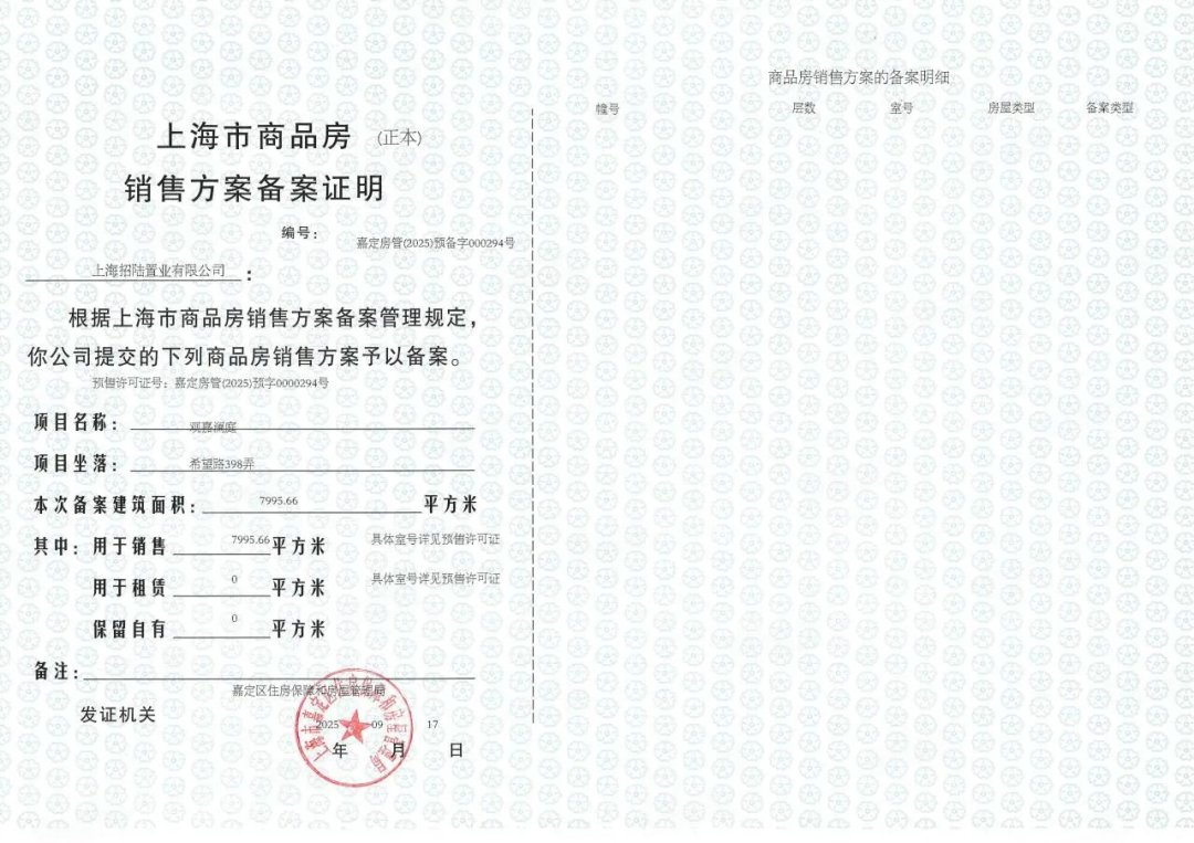- 嘉定房管(2025)预字0000294号 详情发证时间 2025-09-17绑定楼栋