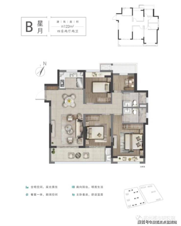 建筑面积约122㎡,四房两厅两卫,全明通透,三面采光,环幕观景。约6.7米宽景阳台,双卧飘窗设计,独立功能间,为生活带来更多可能。
