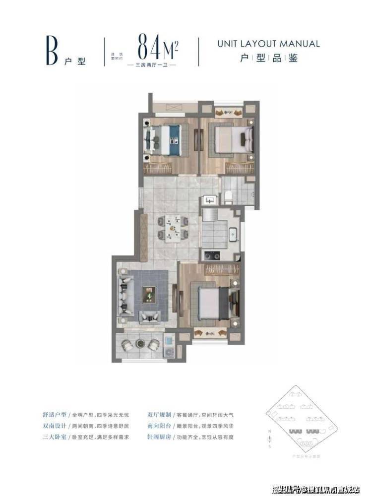 B户型建面约84㎡三房两厅一卫▼