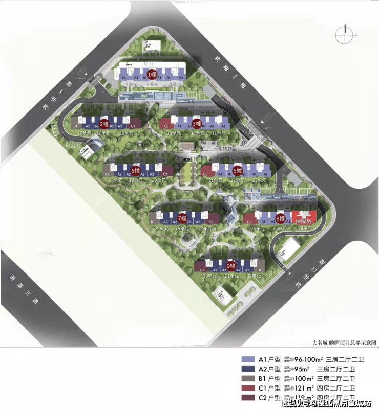 【大名城·映玥】此次推出主力户型为建面约84-96㎡(3房)的洋房,1梯2户私密设计,容积率低至约1.2,建筑密度约21.65%,车位配比1:1.1。