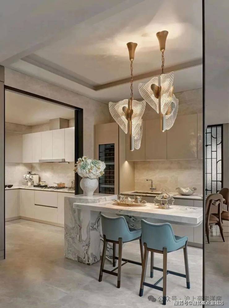 开放式布局消弭功能边界,大理石的冷冽肌理与皮革温润形成理性对话,金属线条勾勒出老城厢砖瓦的抽象轮廓,完成一场跨越时空的材质碰撞。