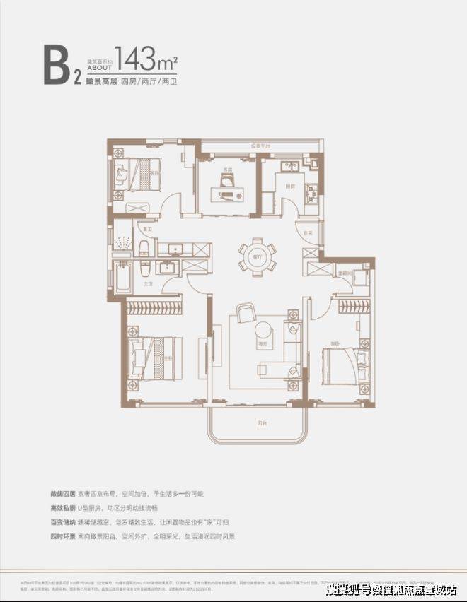 建面约140㎡四房:三开间朝南户型,南北通透,采光条件优质,客厅明亮宽敞,彰显大气布局。