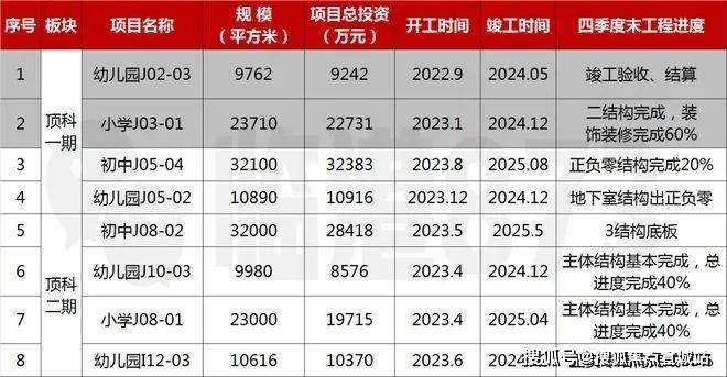 顶科社区公建配套学校建设计划:上实•听海毗邻的J10-3地块幼儿园计划24年12月竣工,J08-01小学和J08-02初中分别计划在25年4月和5月先后竣工。