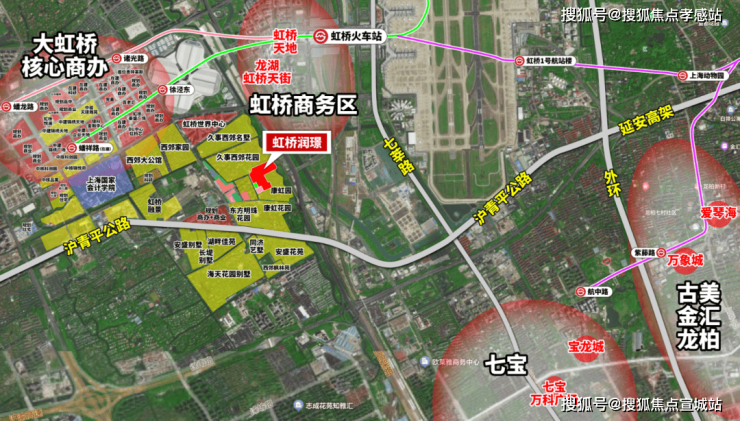 项目东南方向可通过沪青平公路、七莘路、外环快速衔接闵行七宝、古美、龙柏、金汇等板块,这些区域发展成熟,购买力强劲,但新房稀缺!那他们终极改善需求势必向外释放,在地缘上就更容易倾向虹桥主城区。