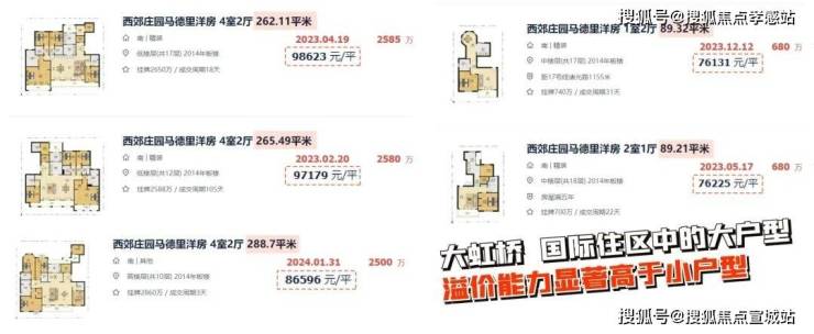 一方面,大虹桥有标杆项目珠玉在前。比如西郊庄园马德里洋房,其90㎡二手房成交价约7.5万/㎡,但260㎡就高达约8.6-9.8万/㎡,大户型溢价更高。