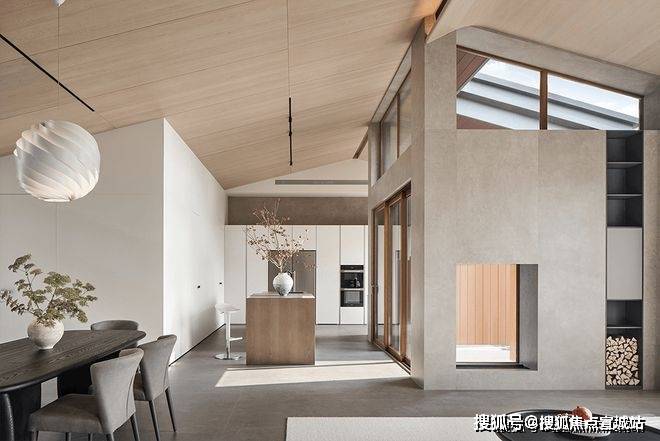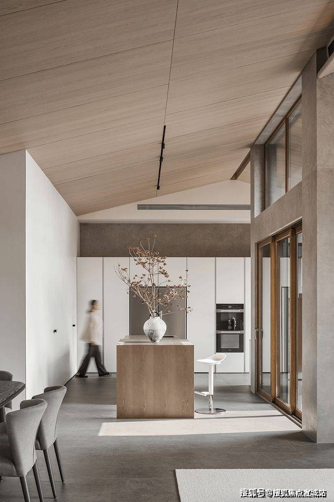 原有西厨空间背后距离室外的高层太近,设计师将其格局进行重新梳理,对其进行了退后处理,把餐厅打造成了一个独具造景关系的私密生态空间。