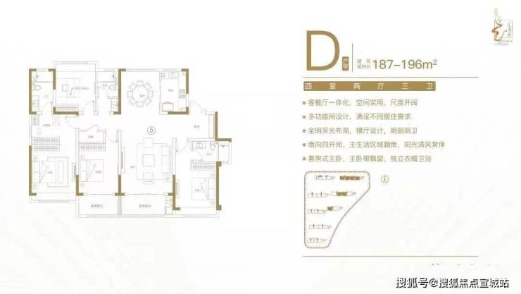 建面约187-196㎡四室两厅三卫户型特点:户型方正,南北通透,动静分区有序;双套房设计,卧室带飘窗,独立卫生间;客餐厅一体化,尺度开阔,全家共享;全明采光布局,告别暗房,明厨明卫;南向四开间,阳光清风常伴。