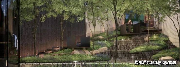 穿过公园的疏林大道,就是西侧主入口,首先映入眼帘的是高约6米的水幕,和下沉式的山水庭院,然后便可进入下沉会所。