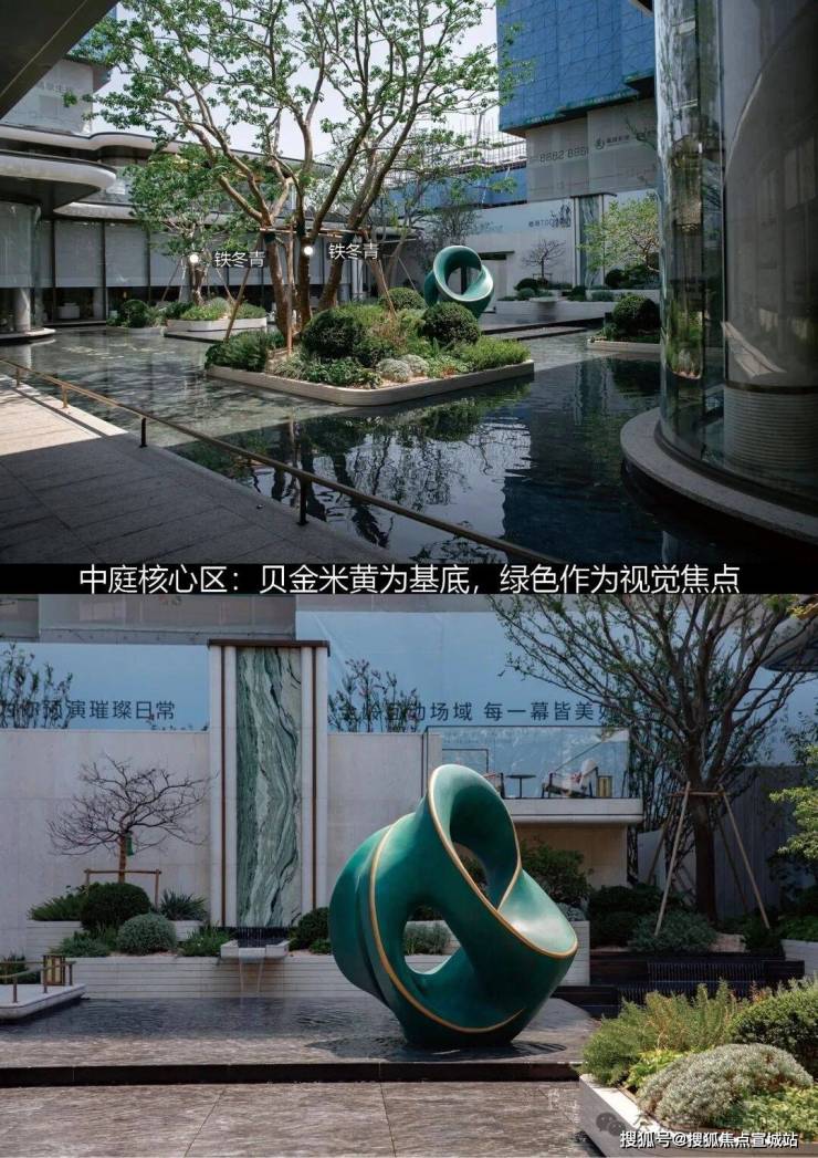 深绿色的莫比乌斯环雕塑是空间的绝对视觉核心,其流畅的曲线形态打破了石材与水景的规整感,增添了空间的艺术张力;雕塑边缘的金色线条与场地内金属栏杆、石材收口的金色细节形成呼应,强化了高端项目的精致感。