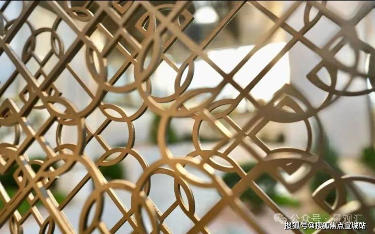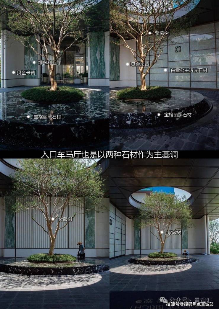 主入口大门以其宏伟的尺度彰显端庄与大气,高达7米的门庭让人瞬间感受到尊贵的气息。门庭选用贝金米黄石材、维多利亚绿与白雪公主奢石,搭配古铜色金属板,巧妙融合冷暖色调,营造出极具张力的美学效果,开启都市奢华新境界。每一细节都透露出非凡的贵气。圆形镂空穹顶之下,一株近7米高的紫薇树卓然而立,阳光倾泻而下时,尽显“紫气东来”的祥瑞意韵。