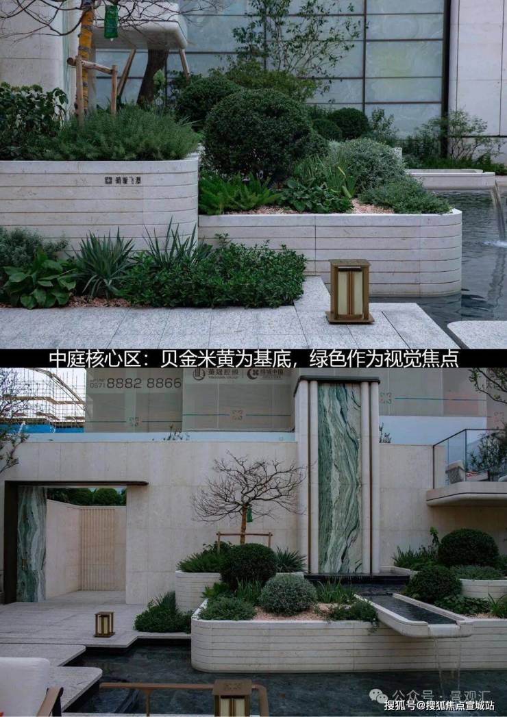 连廊的金属收边、楼栋标识的金属质感处理,甚至是石材的纹理拼接,都体现了绿城对景观细节的极致追求,每一处设计都在为“高端雅致”的空间气质服务,通过细节的品质感提升整个项目的价值感。