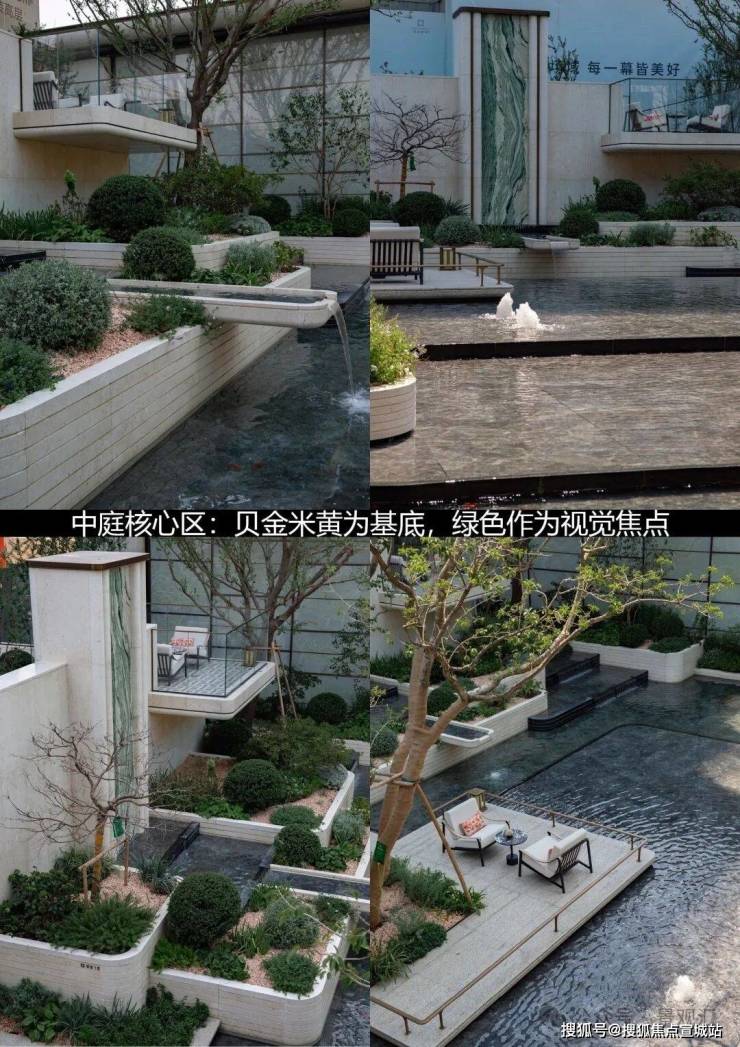 采用“叠水+涌泉”的组合式水景设计,叠水通过石材水槽形成线性落水,不仅带来听觉上的白噪音,也为静态水景增添动态韵律;涌泉则在开阔水面形成点状动态,打破水面的平静,两种水景形态动静结合,让空间氛围更具层次感。