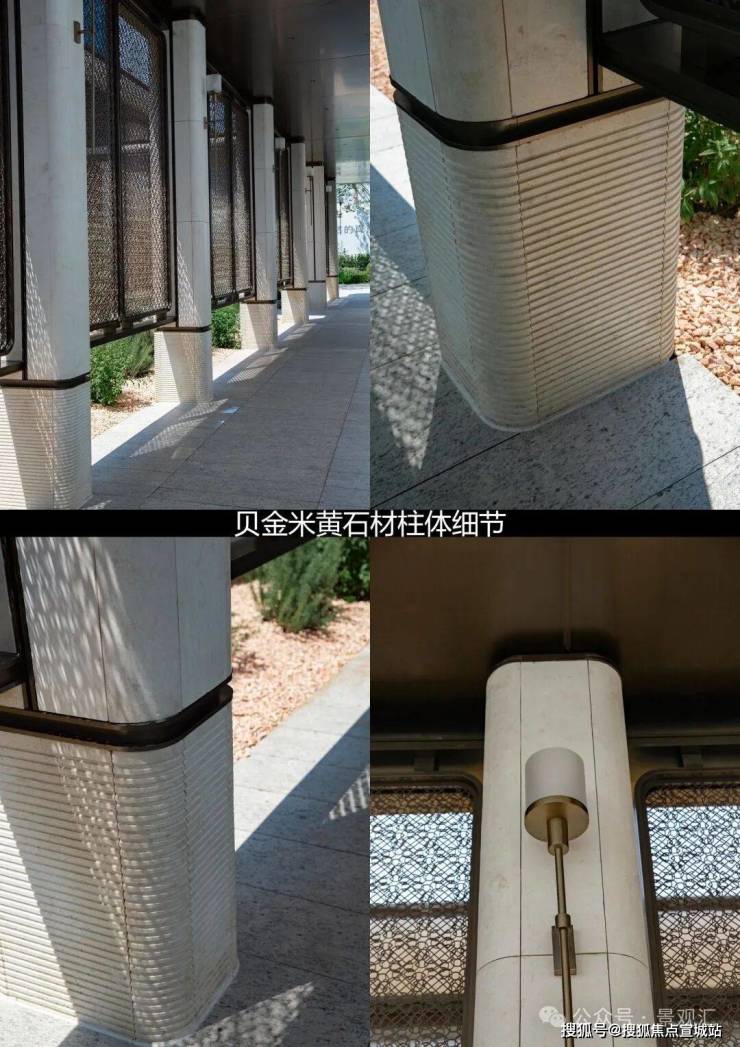 穿过接待大堂来到后场,柱体选用贝金米黄石材,暖调质感弱化了连廊的厚重感,与紫点金麻石材的地面、安哥拉黑花岗岩的水景边缘形成深浅材质对比,既保证了空间的稳重基调,又通过暖色调点缀提升了亲和感,符合高端示范区对材质细