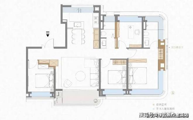 这个户型有独立电梯入户,保障私密性的同时,还多了一个独立都电梯厅,相当于多了一个小厅,可以用来规划摆放收纳柜,变相提高了“得房率”