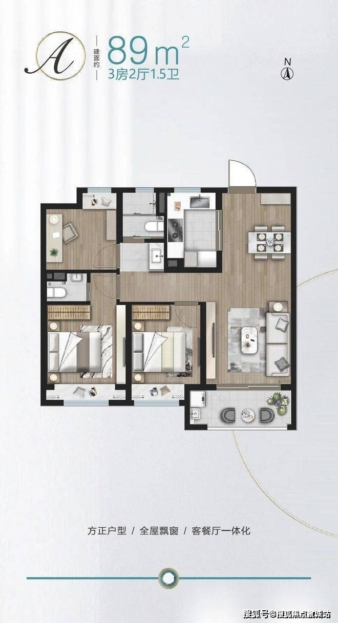 建面约89㎡做3房,功能性上就占尽先机,没想到项目还有1.5卫配置,主卧升级套房,真正实现一步到位!