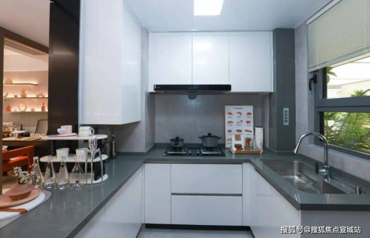 U型厨房,特地做了半开放式设计,简约美观,在视觉上放大空间,也让家人间的互动更加亲密。