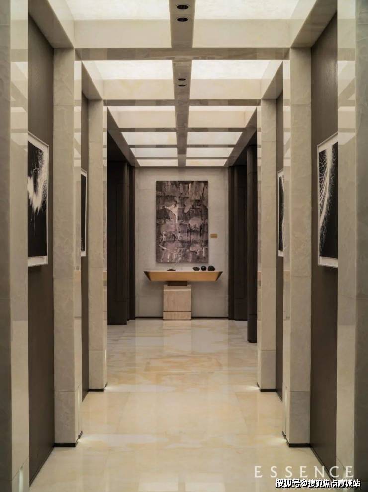 在产品设计中,兆丰ESSENCE讲求人文与艺术的空间理念.建面约730㎡天际平层「归屿」回归居住的原点,开启精神的居所.约4.2米的空中艺廊,从地板到天花,皆为白色玉石通铺,并以天然肌理拼出婉转纹路,色泽在光影流动间变幻.墙壁与地板采用木饰面,每一处精心放置的艺术品,都在为空间注入灵动的气韵与深远的意境.