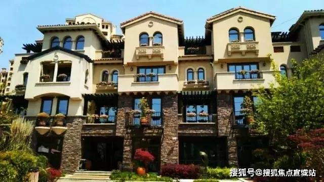 【同润•蓝美俊庭】采用南加州的建筑风格,外立面采用文化石和暖黄色涂料,搭配红色的筒瓦、烟囱、铁艺栏杆等建筑,尽现南加州原乡风情。