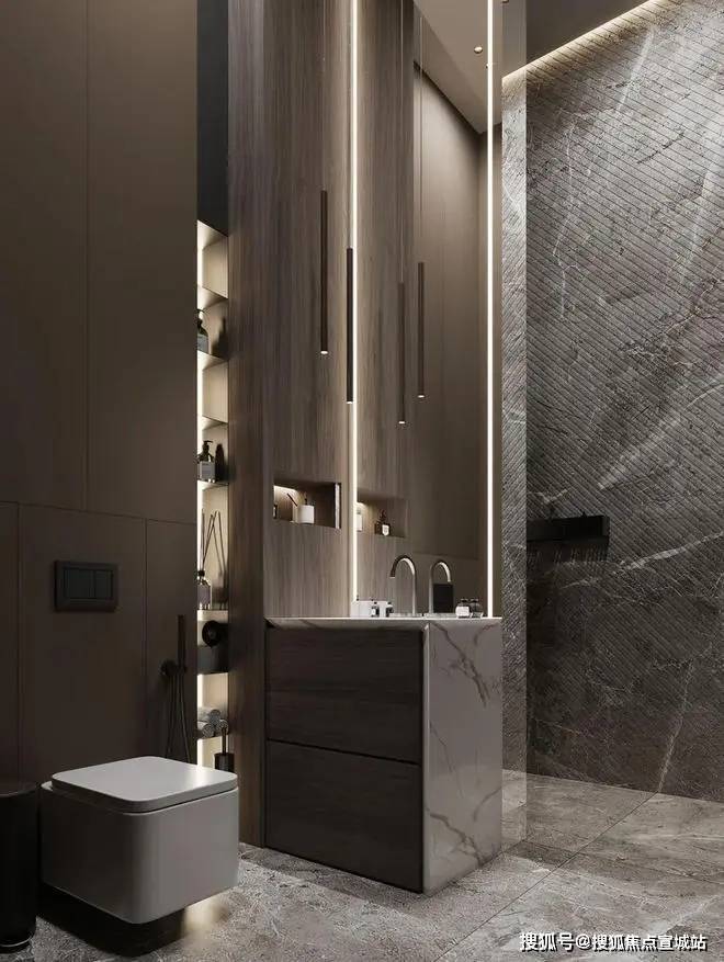 浴室是简单的大理石墙面构造,木色质感的柜面给整个空间增添了高级的轻奢风.上海闵行天宸国际社区售楼处电话☎:400-8558-334