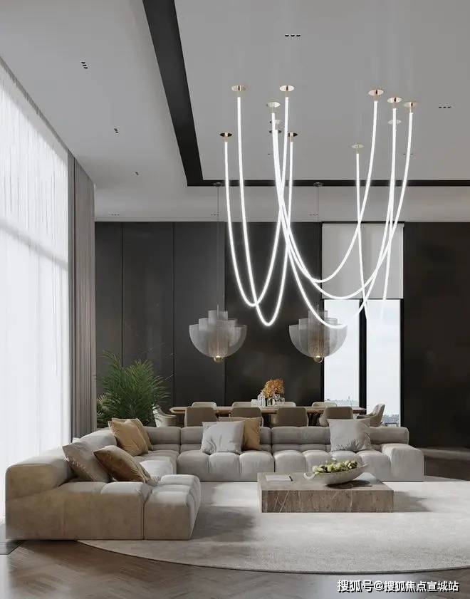 柔软的沙发,坚硬的茶几的布置,构成了客厅大气通透的风格.上海闵行天宸国际社区售楼处电话☎:400-8558-334