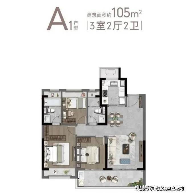 建筑面积约105㎡,3室2卫▼