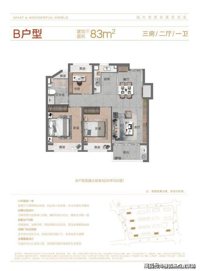 同时厨房双移门设置,打开了室内视野。做饭的同时能与客厅里的家人随时互动,打破了原本厨房的“孤独感”,赋予家庭更多情感交流。建面约83㎡不仅做到了3房极致功能,三开间朝南+动静分区+全卧飘窗,给家庭创造了更舒适的户型空间。