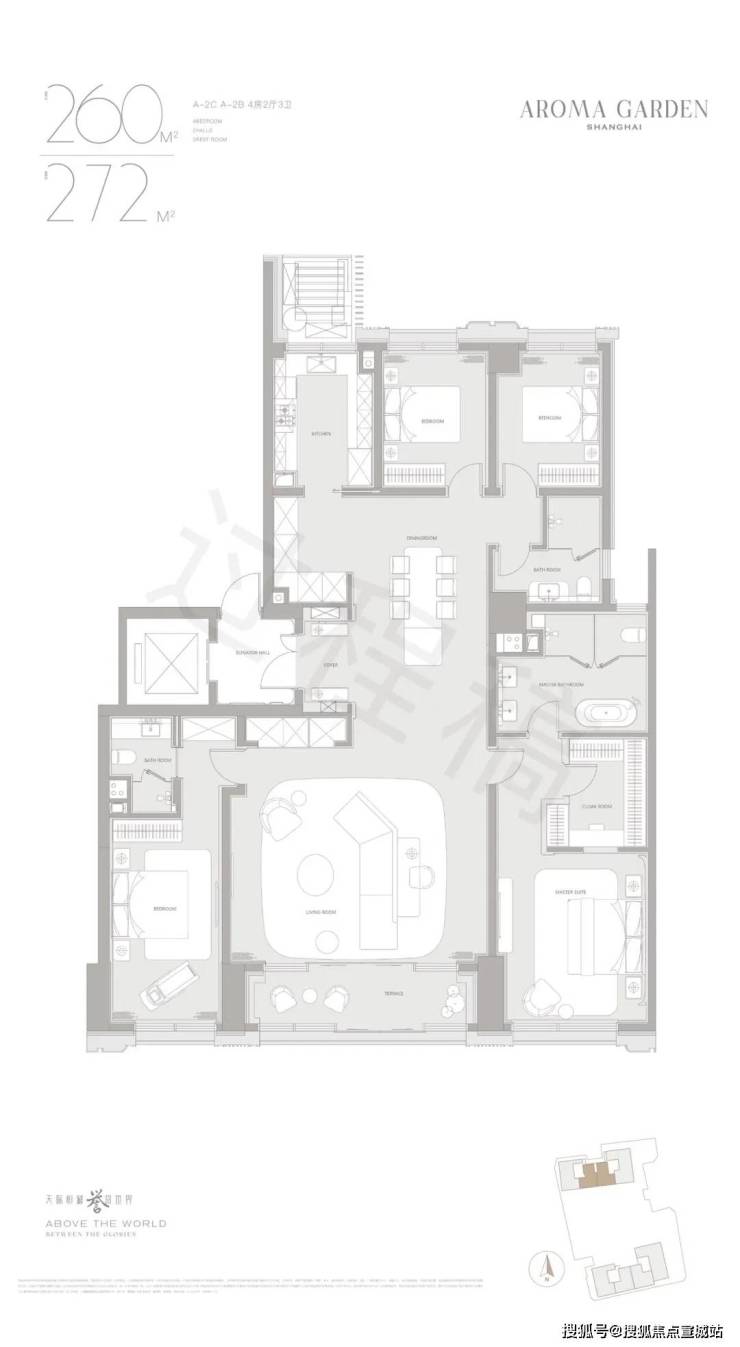 其中,A地块共计150套天际大平层,面积为建面约264-901㎡,主力户型为4房-5房。