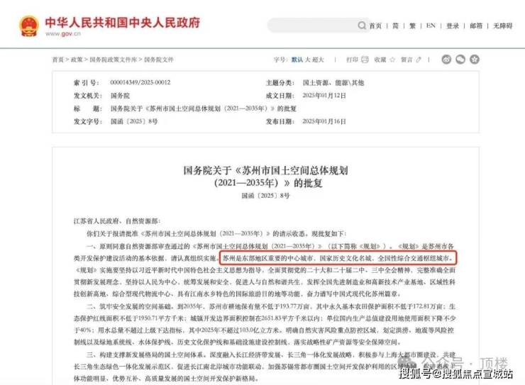 2025年1月12日,国务院批复了《苏州市国土空间总体规划(2021-2035年)》,这是苏州历史上第一部“多规合一”的国土空间总体规划。国务院批复明确苏州是东部地区重要的中心城市,国家历史文化名城,全国性综合交通枢纽城市。