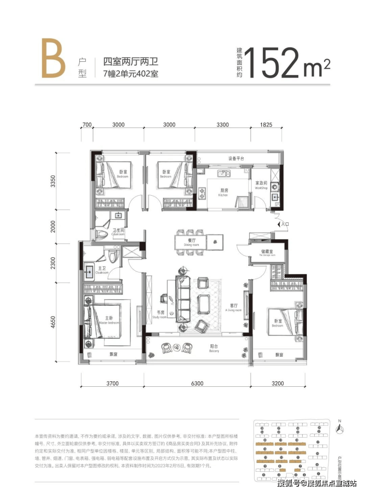 四房户型均为四叶草户型,方正通透,双阳台、最大至6.3米宽大尺度客餐厅,且均配置独立储藏间。