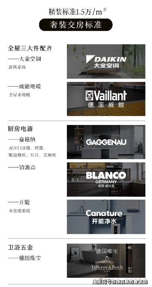 精装标准:顶奢大平层精装标准达1.5万元/㎡,配备大金中央空调、威能地暖、科勒卫浴、方太厨电等国际一线品牌。