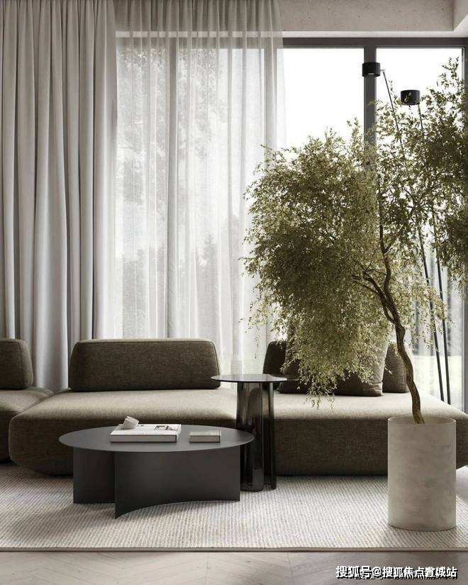 苏州上华璟庭售楼处电话☎:400-8558-334(售楼处预约看房热线)客厅中,设计师选用暖灰色作为空间的主色调,搭配上原木色的地板,奠定现代极简的空间基调.灰绿色的布艺沙发搭配上圆形的小茶几,展现出空间的几何美感.沙发旁摆放着绿植,为室内空间增添了一抹色彩,呈现出现代空间的生活美学.